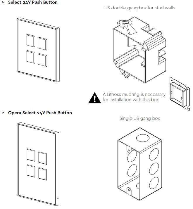 Lithoss mudring is required for the Square configuration option when installing with a US double gang box. The Opera (rectangle) configuration can be installed on a standard US gang box.